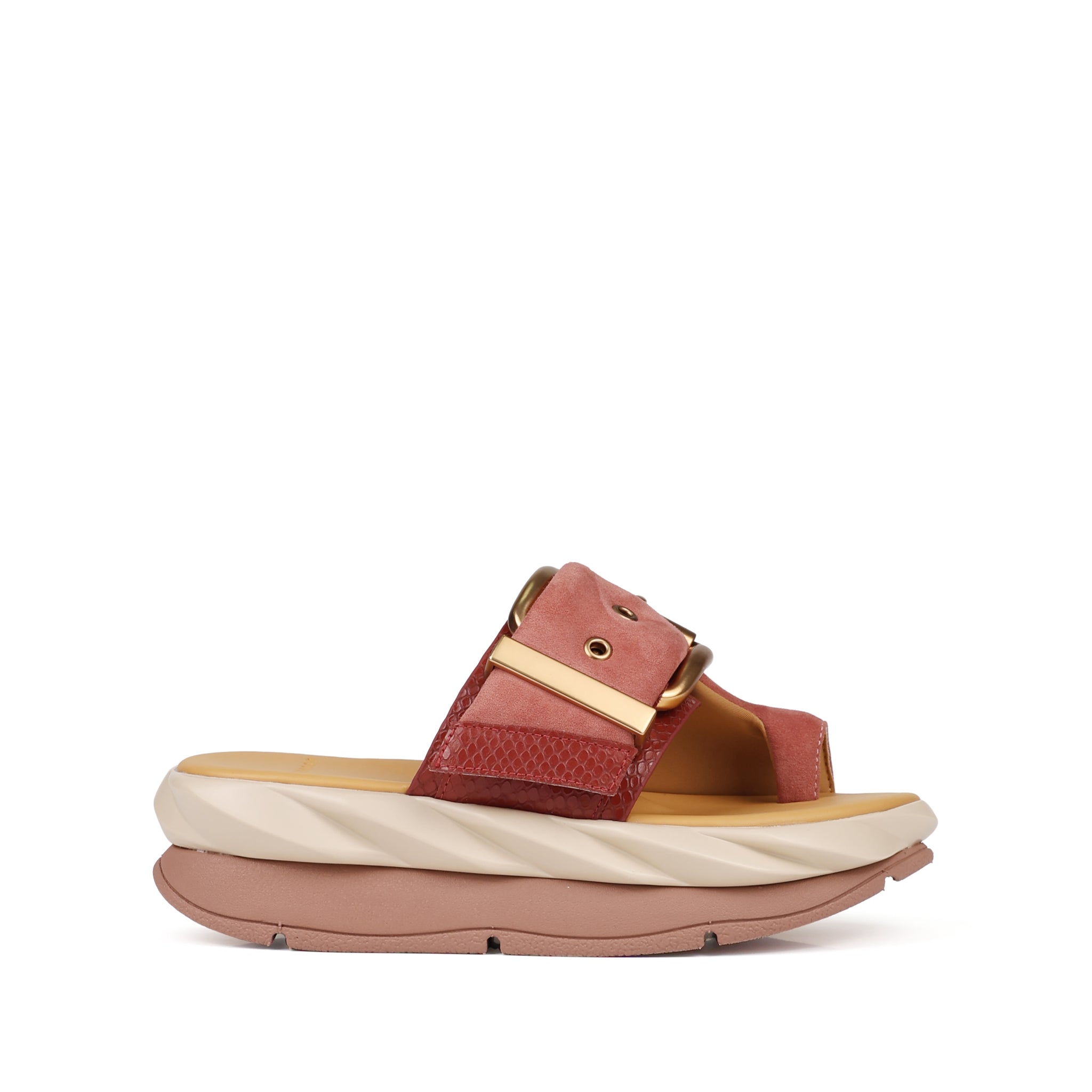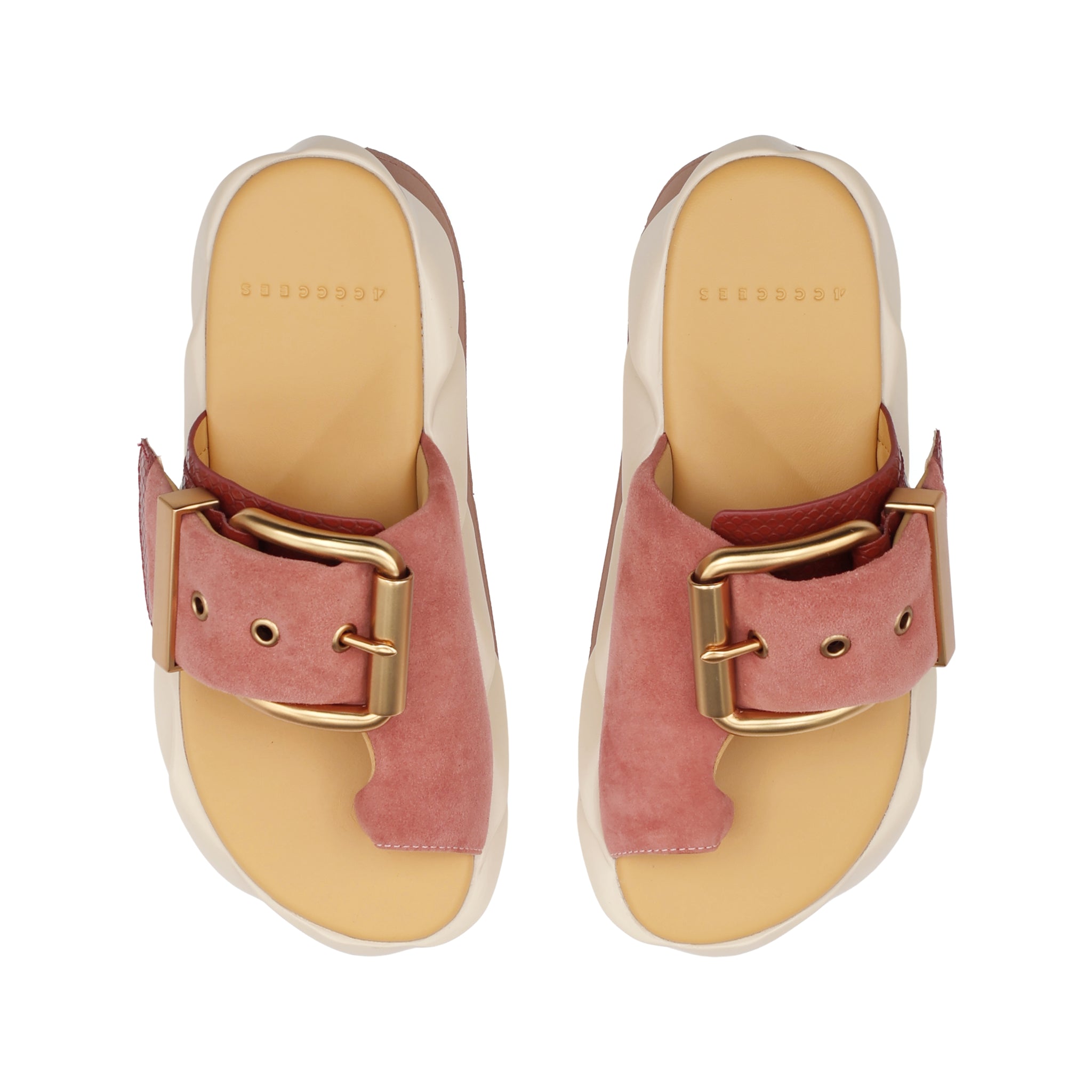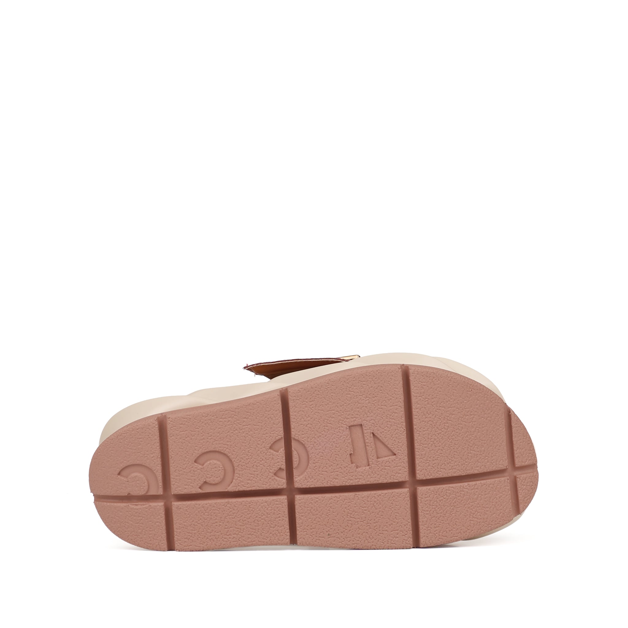 Inspired by the twisting motion of flower petals or whipped cream, MELLOW’s outsole is divided into a sturdy bottom and a softer, ripple-designed upper part for superior shock absorption and durability. The oversized metallic buckle enlivens the look of the Mellow Glow.