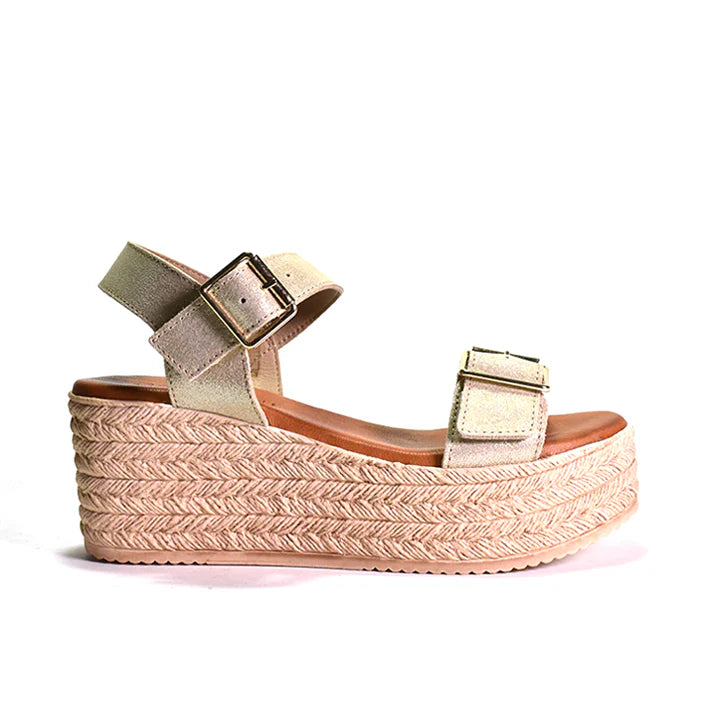 Sandal with buckle strap on a textured platform. Cushy insole padding pampers your feet all day long. Adjustable quarter strap with metal buckle. Made in Spain.