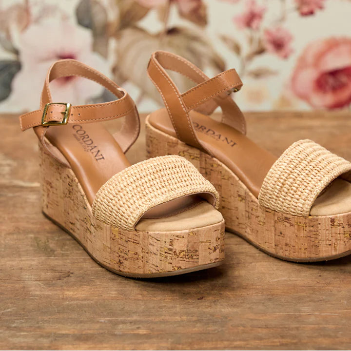 Woven raffia upper with leather with quarter strap. Cork wrapped wedge. Adjustable metal buckle. Leather lining. Lightly padded leather footbed. Synthetic sole. Made in ItalyMEASUREMENTS:Heel Height: 3 1/4 in.Platform Height: 2 in