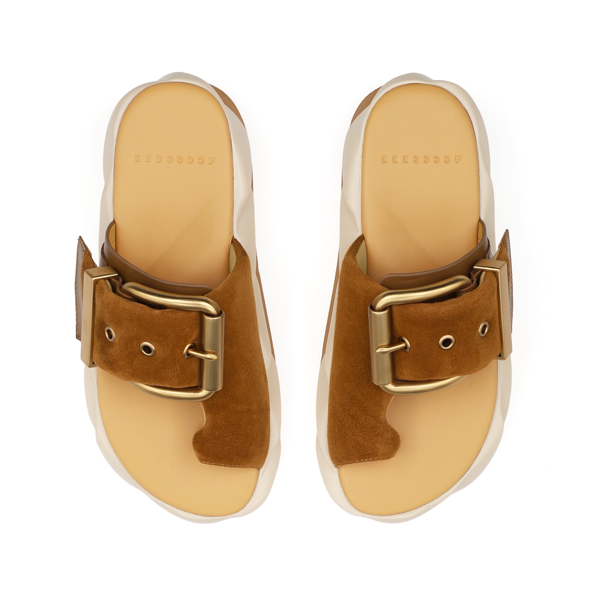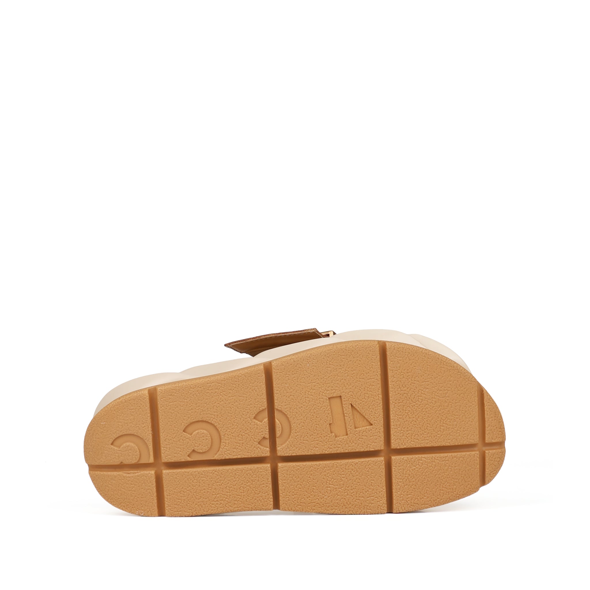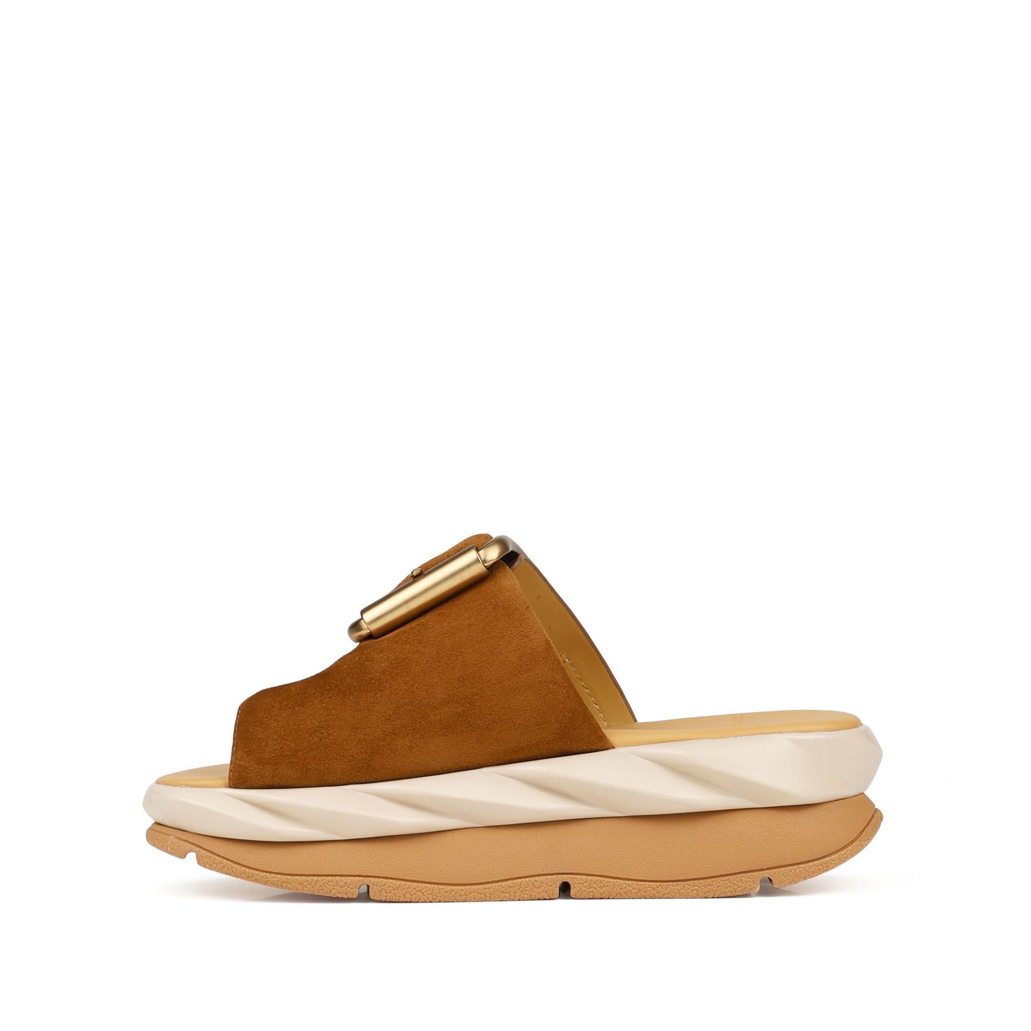 Inspired by the twisting motion of flower petals or whipped cream, MELLOW’s outsole is divided into a sturdy bottom and a softer, ripple-designed upper part for superior shock absorption and durability. The oversized metallic buckle enlivens the look of the Mellow Glow.