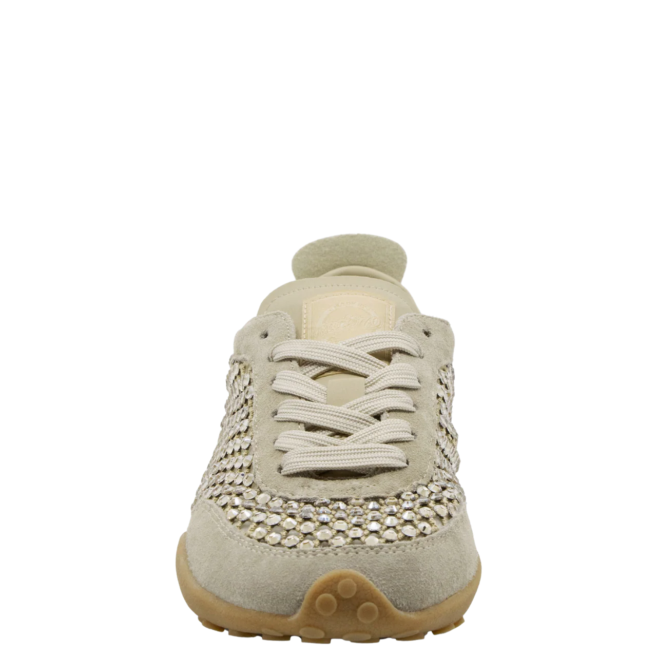 - Handcrafted leather, suede, and rhinestoned mesh upper